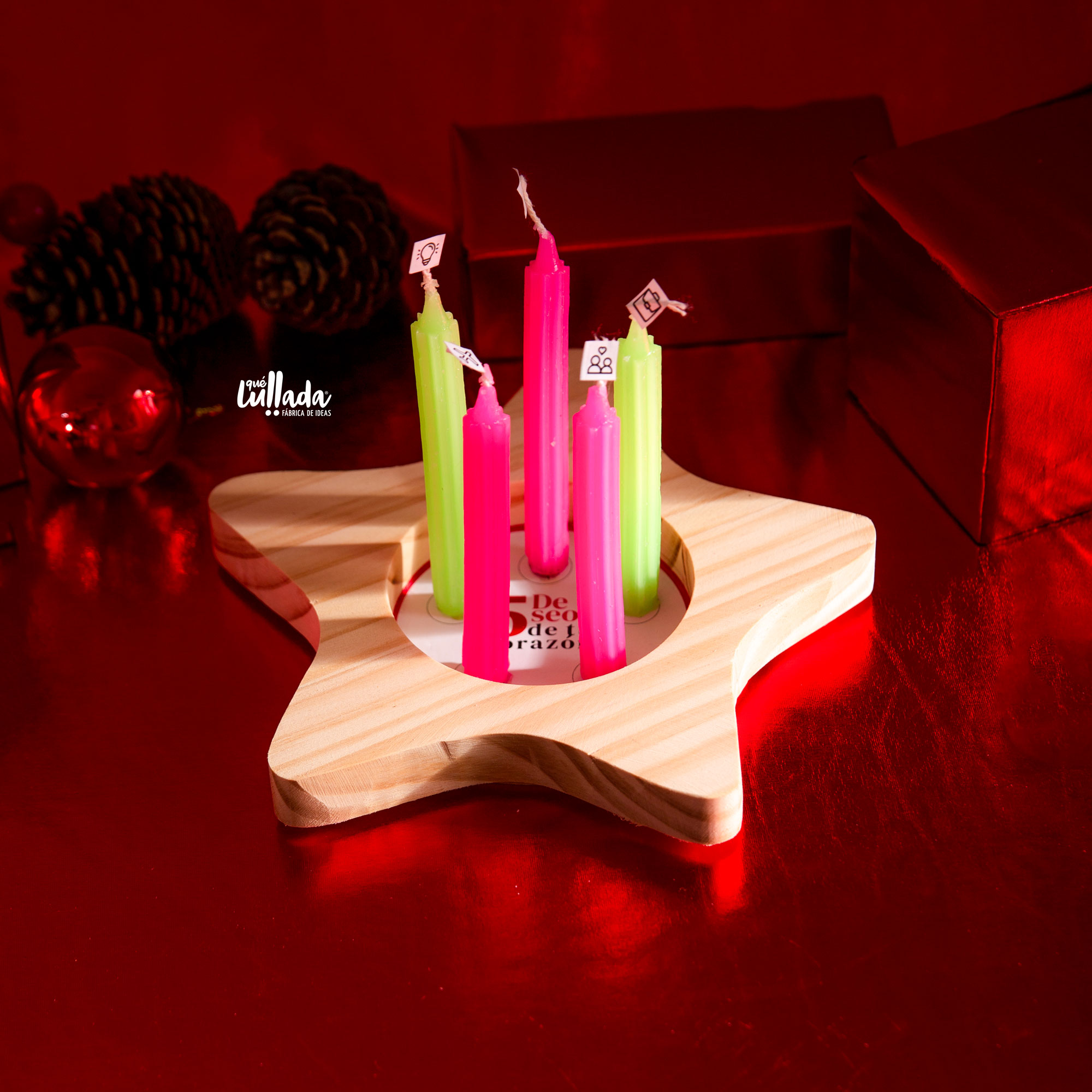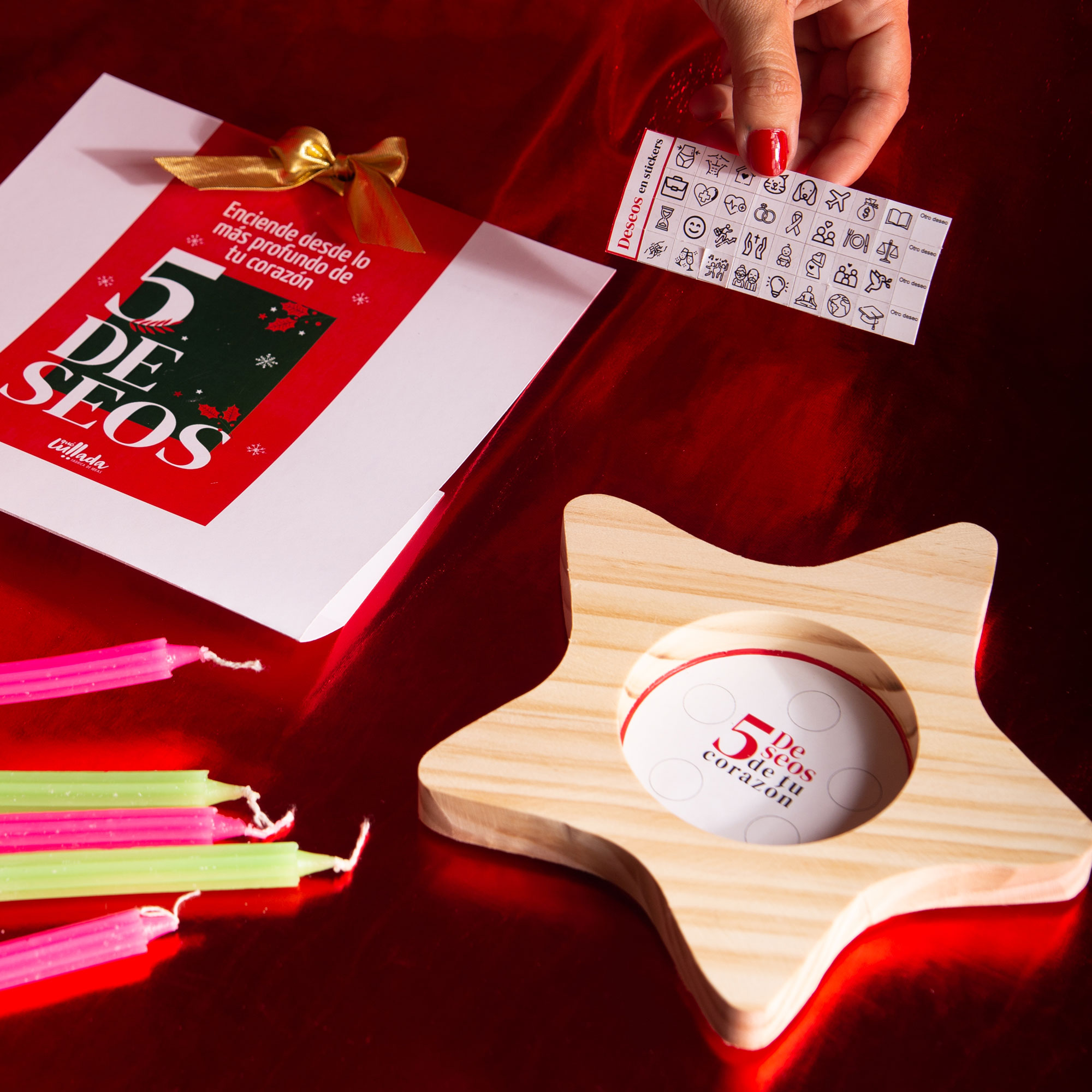 Este Kit es especial para no hacer regueros de cera y evitar quemaduras con la misma esperma, ya que se coloca cada vela dentro del círculo interior de la estrella de madera de pino; pero antes de ello, te enviamos unos stickers representados en los deseos más pedidos esta noche de velitas, para que elijas tus 5 favoritos y los pegues en el fondo de la estrella para que la luz de cada vela los ilumine y los haga realidad